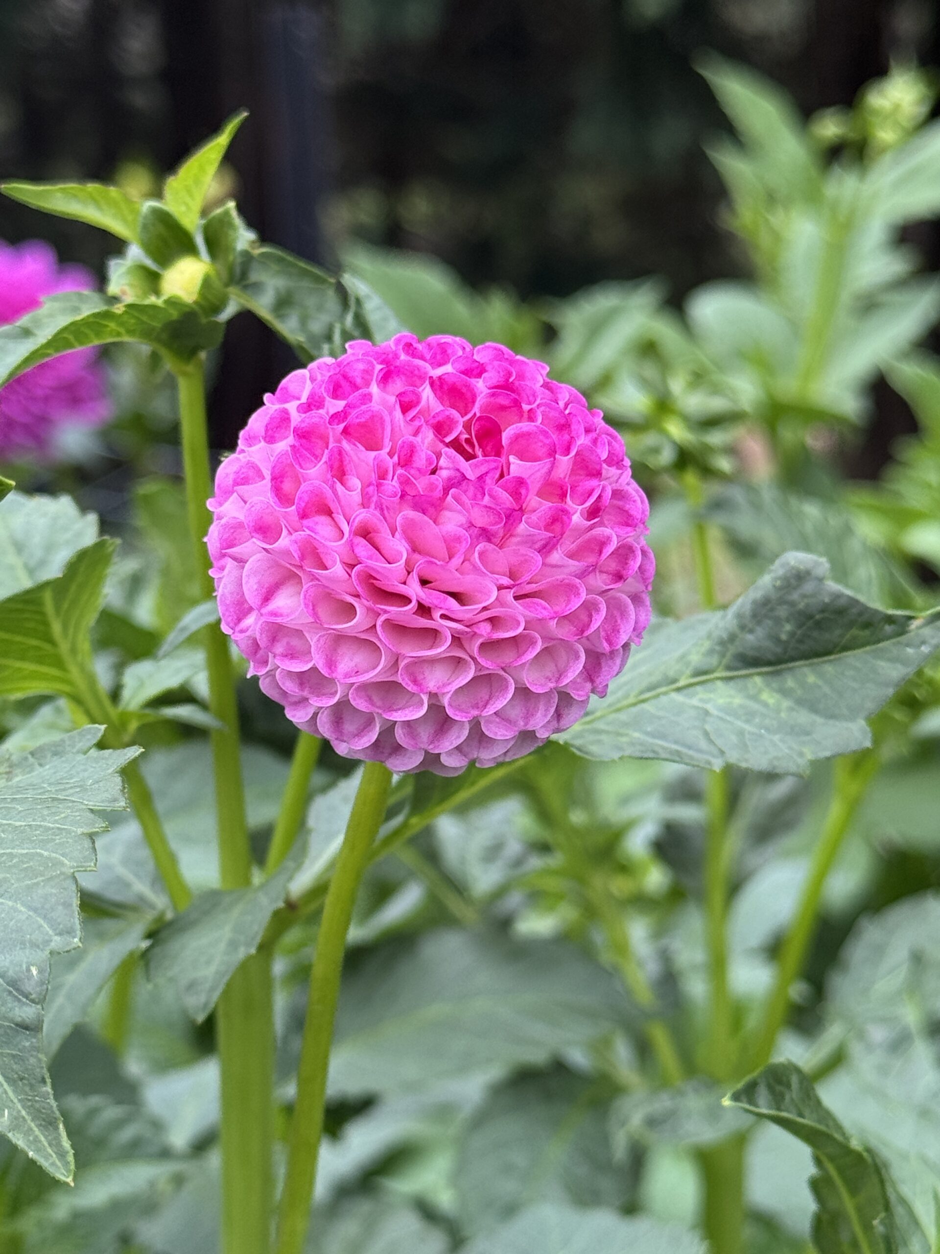 A candy pink or Cerise pink pompom dahlia that produces an abundance of small blooms on light green stems.Plant is on the smaller size measuring about 1m and blooms usually measuring only 2inches in diameter