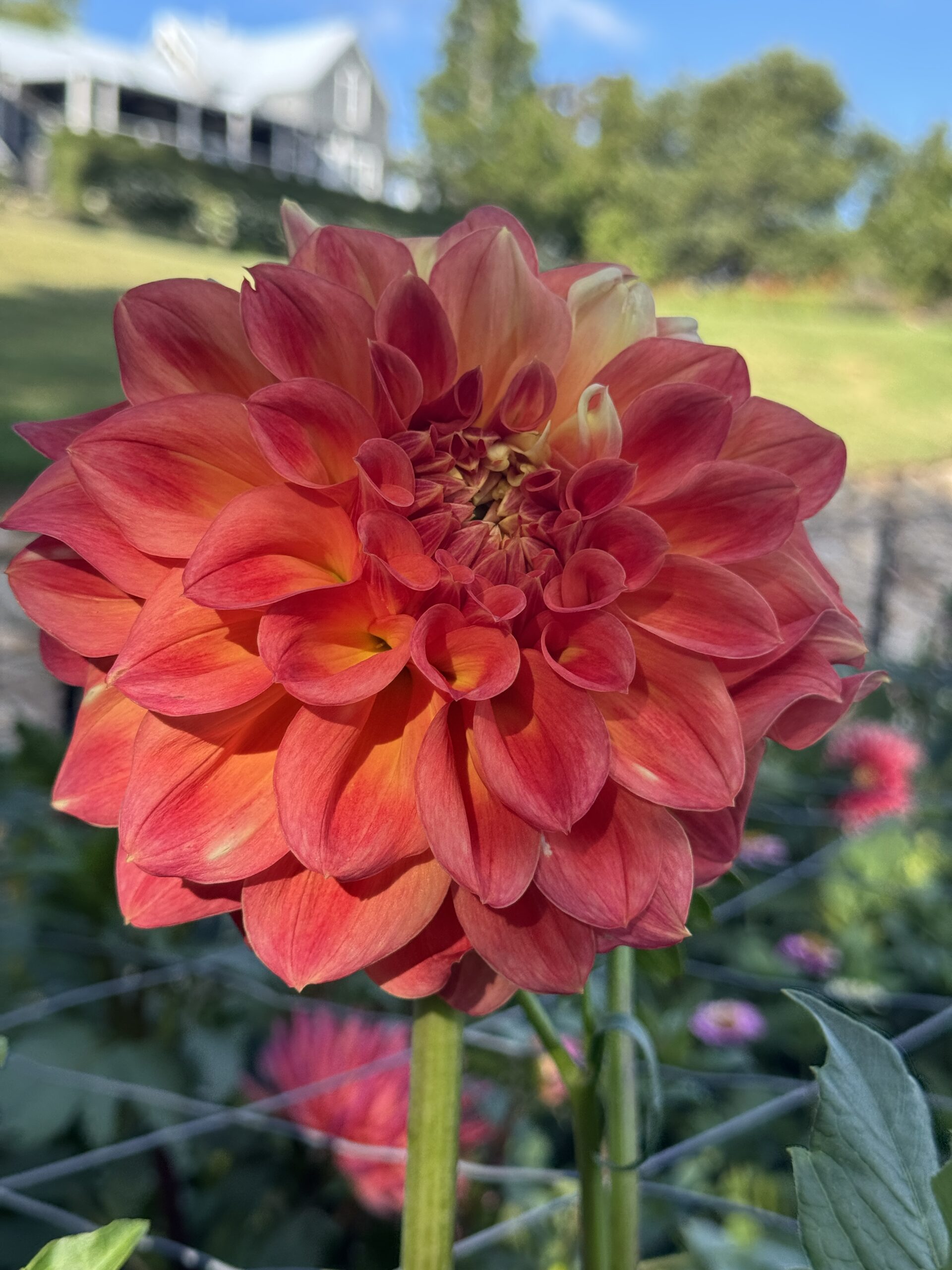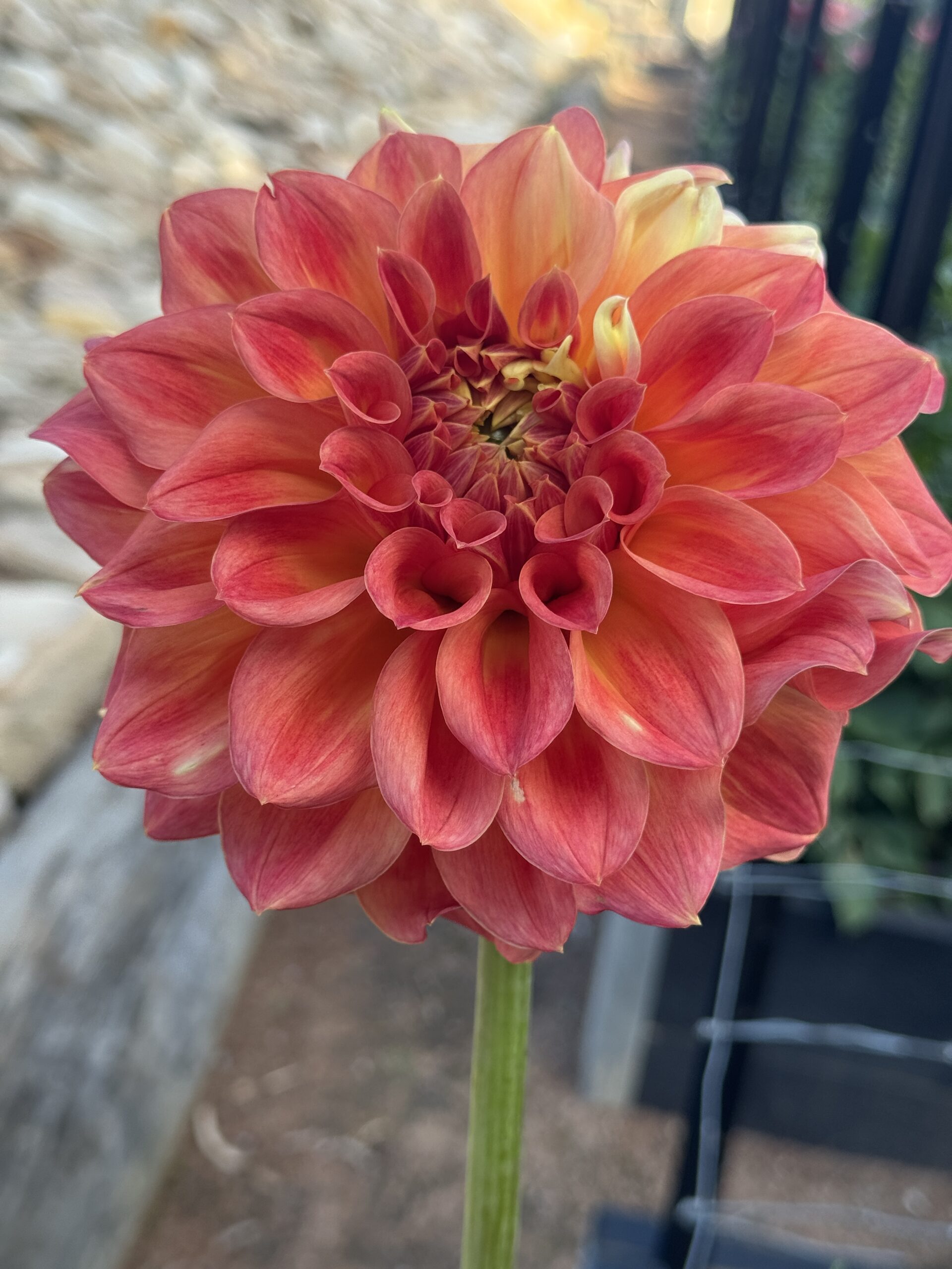 Gorgeous burn orange/dusty pink/vibrant orange dahlia.