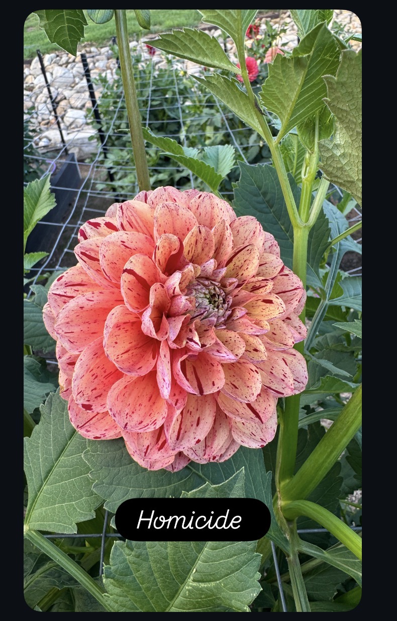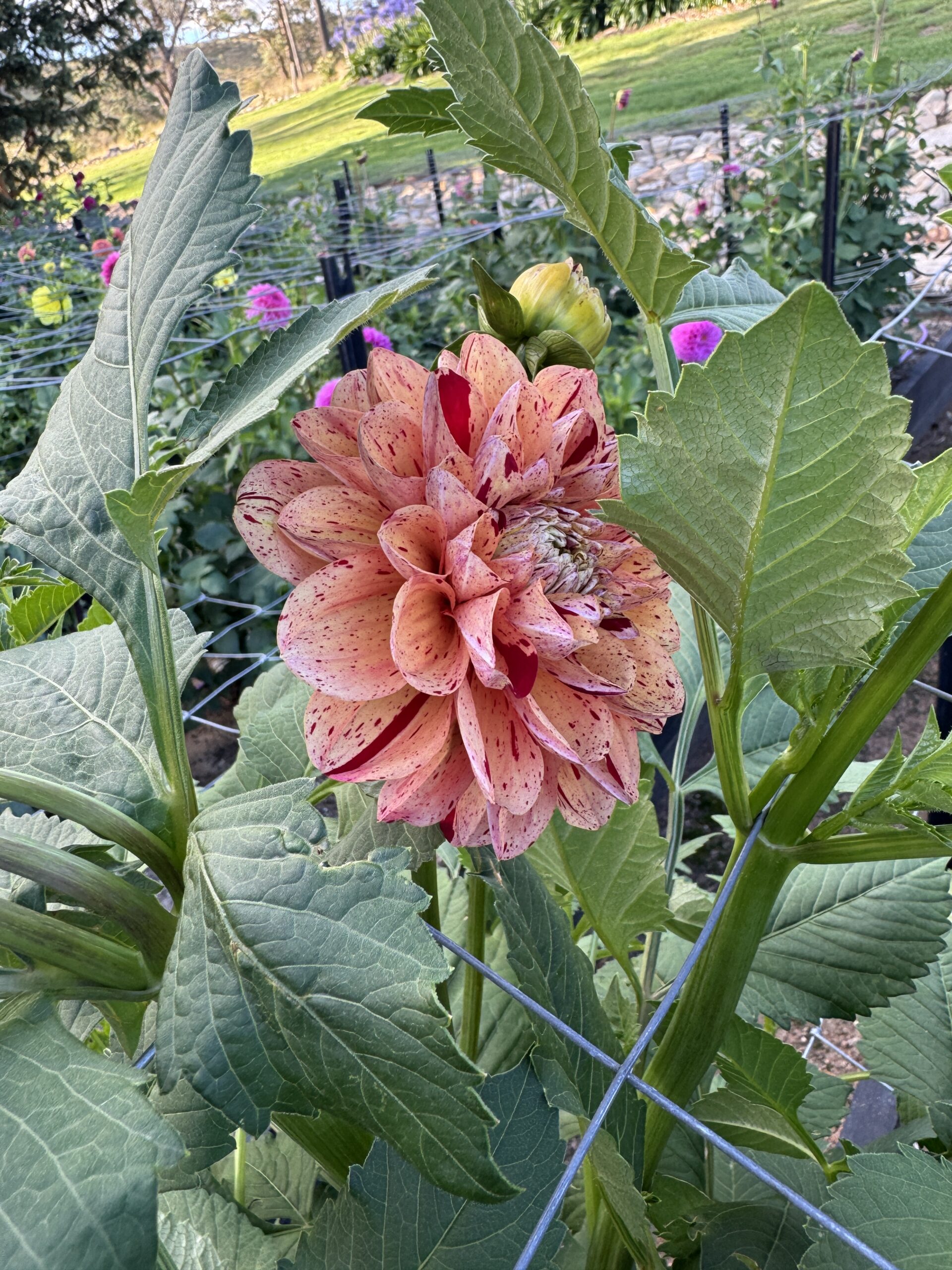 This striking soft peachy apricot dahlia has flecks of crimson red on its petals. Whilst some blooms have a pink blush towadrs the tips, the blooms often present in many different colorings