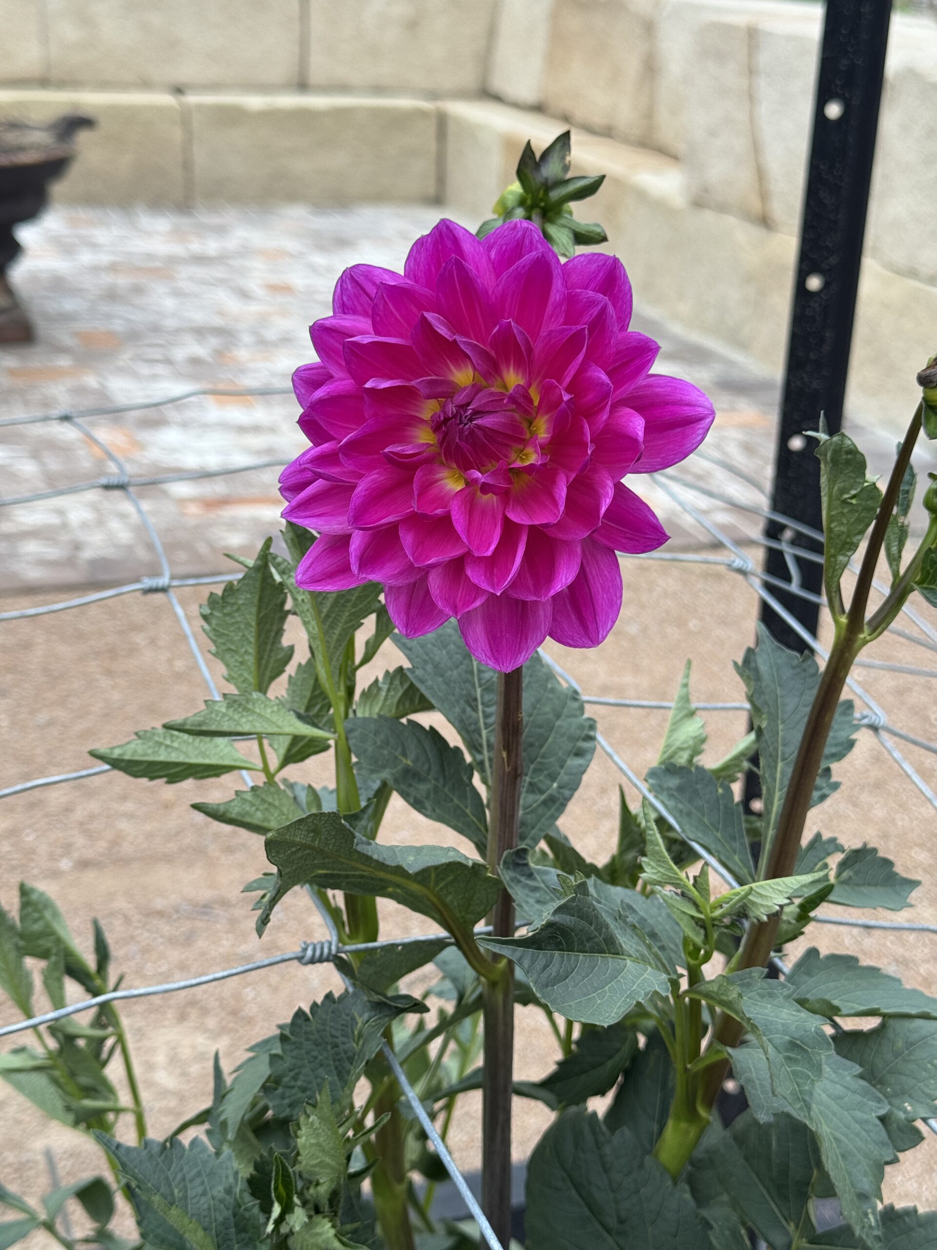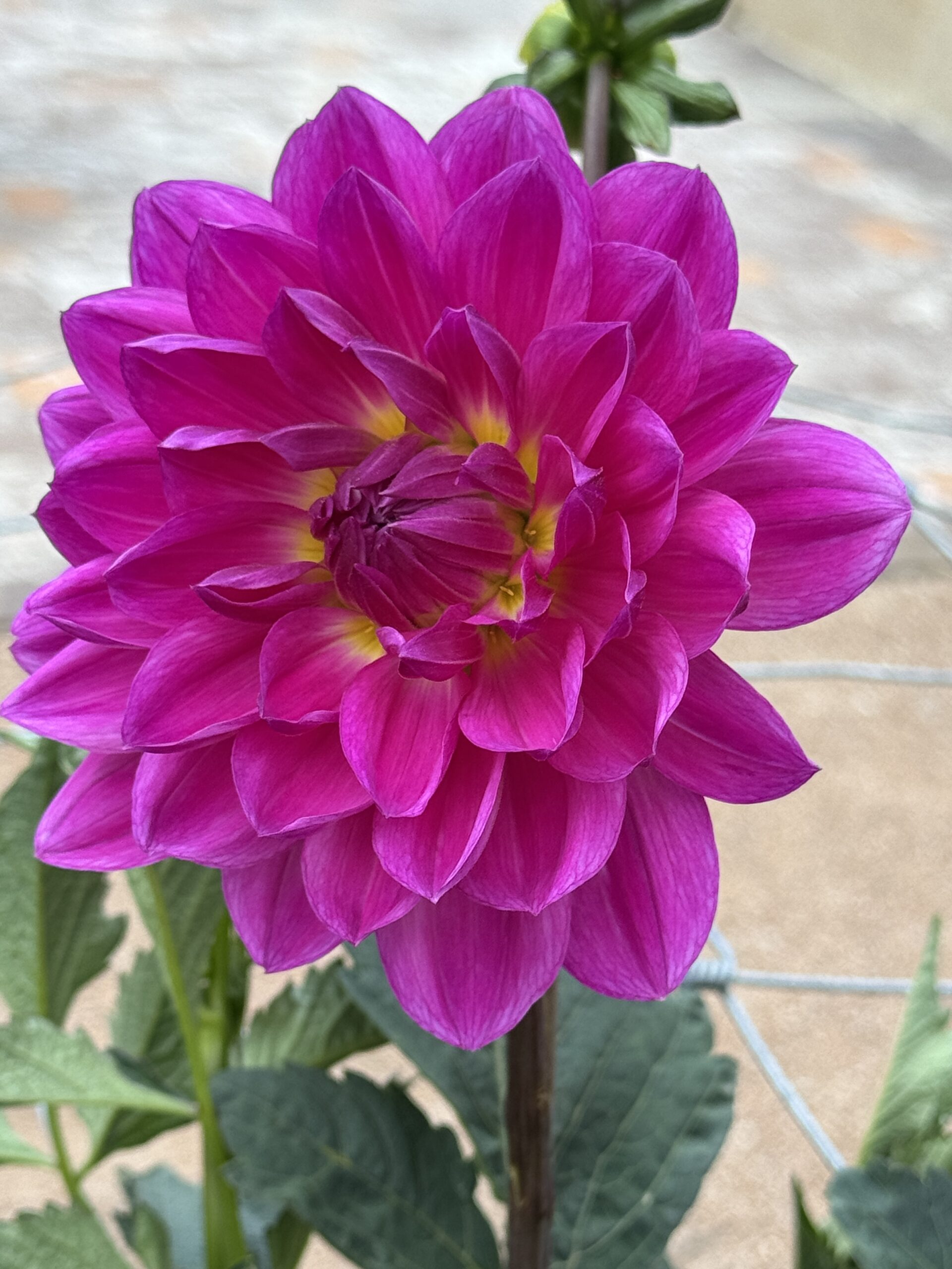 Stannum Jill is a waterlily type dahlia with bright hot pink petals and a yellow base.